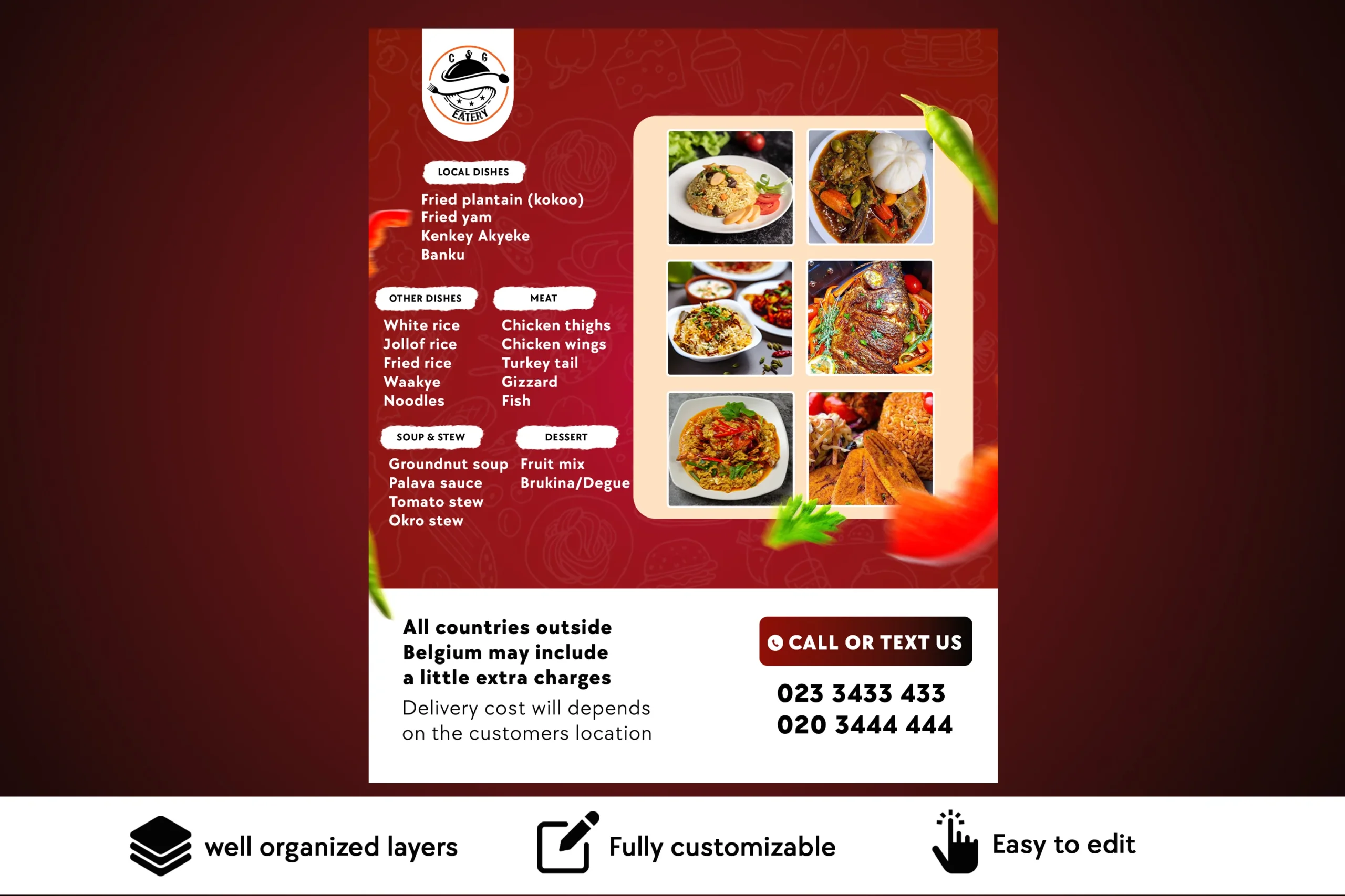 Promote your restaurant or food business with this C&G Eatery Food Flyer PSD Template. This free, editable flyer showcases a rich menu of local and continental dishes like fried rice, waakye, banku, jollof, grilled fish, and more. Designed with a clean layout and appetizing visuals, it’s perfect for African or international eateries, food delivery services, and catering businesses. The PSD file is fully layered and easy to customize in Adobe Photoshop.