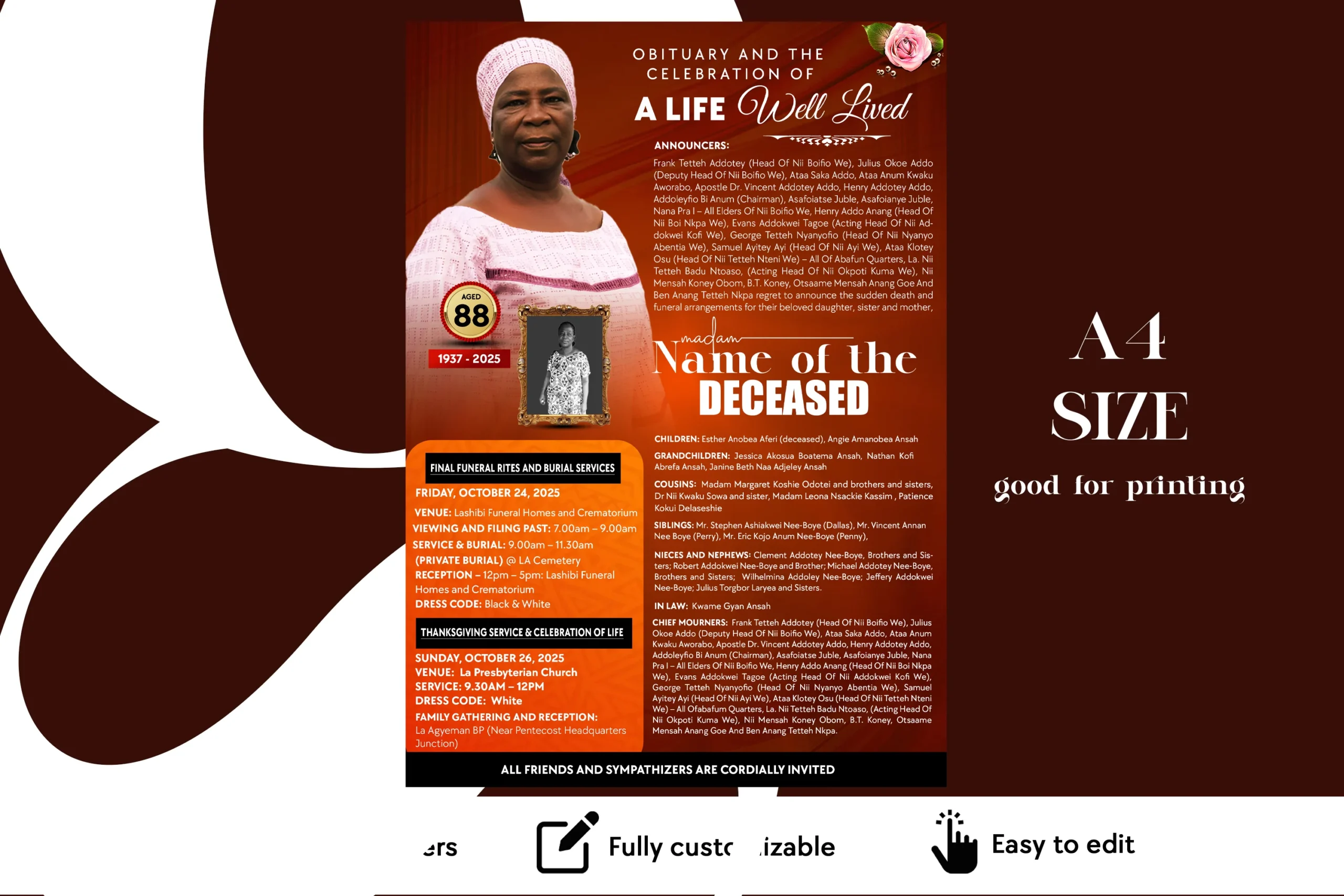 Elegant obituary and funeral flyer PSD template. Ideal for memorials and celebration of life services. Fully customizable and print-ready.