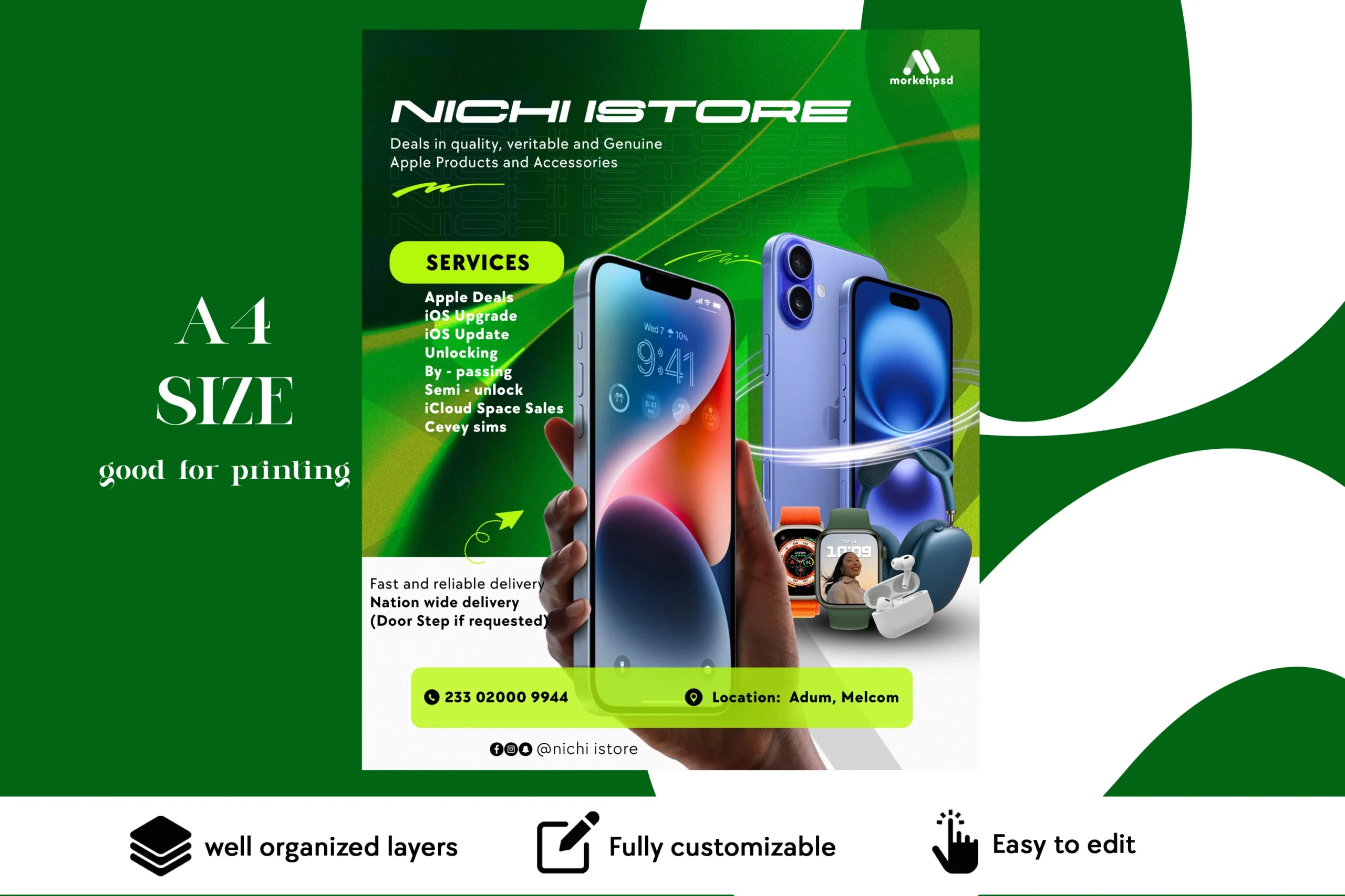 Showcase your Apple products and tech services with this iStore Promo Flyer PSD Template from Morkeh PSD. This modern and professional flyer is designed to promote iPhone sales, iOS updates, unlocking services, Apple accessories, and more. The layout features sleek green tones with realistic device mockups, making it ideal for mobile shops, Apple dealers, and gadget repair centers.