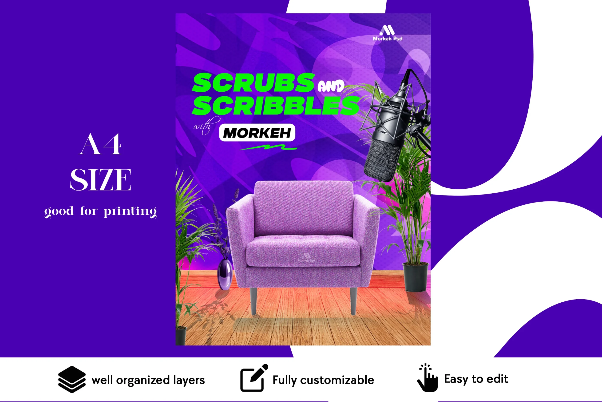 Promote your podcast or talk show with this creative Scrubs and Scribbles Podcast Flyer PSD Template by Morkeh PSD. Designed with a modern purple background, studio microphone, and comfy seat setup, this free flyer is perfect for podcasters, YouTubers, radio hosts, and content creators. It’s fully editable in Adobe Photoshop — allowing you to customize text, colors, and layout to match your show’s theme.