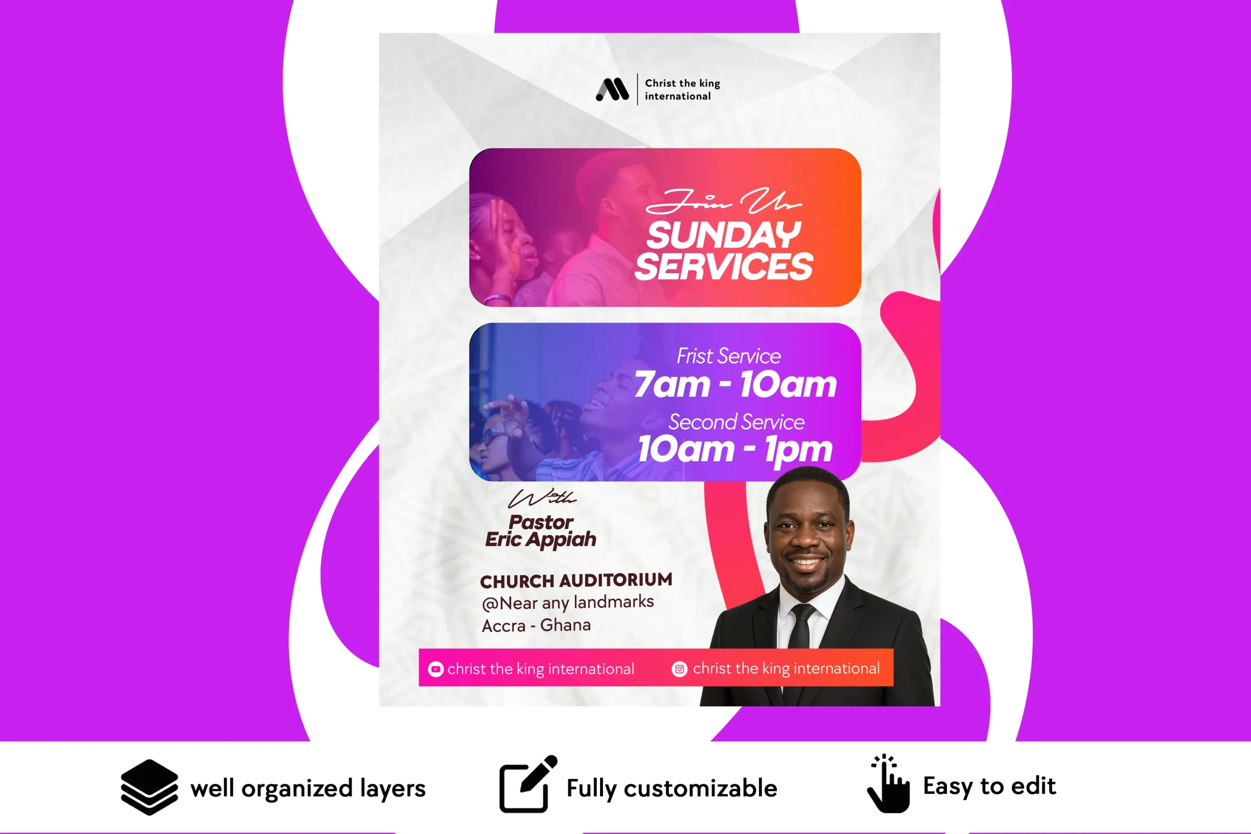 The flyer is clean, uplifting, and ideal for churches, ministries, or Christian organizations looking to inspire attendance and engagement. With well-organized layers and easy customization in Photoshop, you can quickly update colors, text, and images to match your ministry branding.